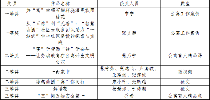 “公寓的故事”主题系列活动是由山东省教育厅主办,每年均有100余所高校参与。曲阜师大高度重视,精心组织,依托“一站式”社区建设广泛发动,共收到作品百余项。经评委严格审核、层层筛选,择优报送。其中《共“寓”幸福石榴籽浇灌民族团结花》《从“五感”到“无感”:“智慧曲园”社区云服务团队助力“一站式”学生社区建设的探索与实践》获公寓案例一等奖;《“寝”于劳动“钟”于奋斗——让劳动教育在公寓开出文明之花》和《“室”间万物安全第一》获公寓育人精品课二等奖和三等奖;《一封家书》获微视频二等奖;《缘起曲园“寓”你同行》和《解语花》分获征文比赛的二等奖和三等奖。