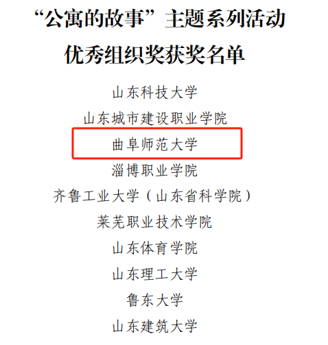 曲阜师大学生工作处讯 近日,山东省教育厅公布了2023年高校“公寓的故事”主题系列活动获奖结果(鲁教发展函〔2024〕3号),曲阜师大推荐的10项参赛作品中获奖7项,其中一等奖2项,二等奖3项,三等奖2项。根据参赛组织和获奖情况,学校获得2023年高校“公寓的故事”主题系列活动优秀组织奖,获奖数量和质量均居全省高校前列,创学校在本项活动中获奖历史新高。