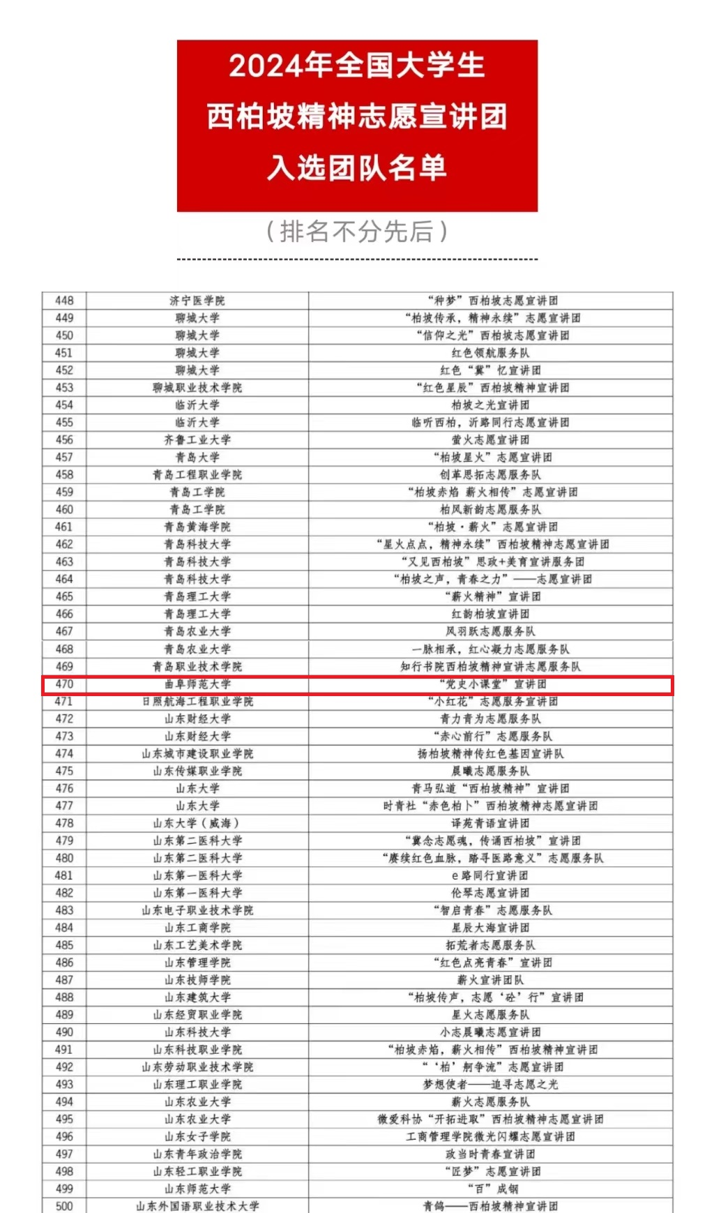 曲阜师大历史文化学院讯  近日,2024年全国大学生西柏坡精神志愿宣讲团遴选工作结束,曲阜师大历史文化学院“党史小课堂”宣讲团在众多高校宣讲团队中脱颖而出,成功入选“全国大学生西柏坡精神志愿宣讲团”。该活动由团中央青年志愿者行动指导中心、共青团河北省委、中共石家庄市委、中国青年志愿者协会秘书处共同举办,面向全国遴选了1000支大学生志愿宣讲团队。