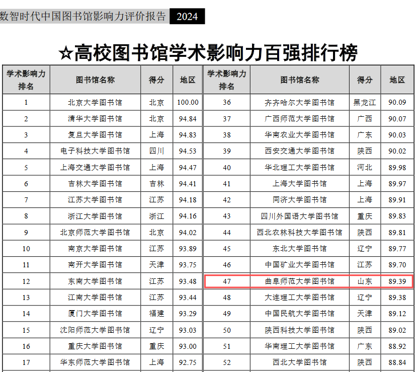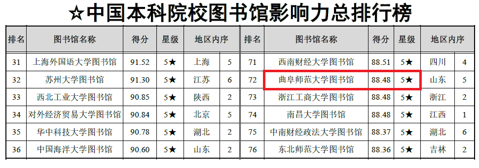 据悉,《数智时代中国图书馆影响力评价报告(2024)》是对全国2820所普通高校图书馆进行的综合性评价,报告严格按照基础实力、网站影响力、新媒体影响力、社会影响力和学术影响力5个一级指标和21个二级指标进行权重评分。目前,曲阜师大图书馆已构建起了两地三馆一体化智慧管理和服务新体系。通过多样化空间布局、数字化智能设备、智慧管理和服务等全方位推进“未来学习中心”建设;通过整合学校各类学习资源,融合新一代信息技术,打造了支撑学习方式变革的新型学习组织,打造了学校教学科研服务新高地。下一步,图书馆将致力于智慧化转型,不断为读者提供数字化、智能化、专业化、特色化和个性化服务,高质量满足广大师生教学科研对文献和空间的需求。
