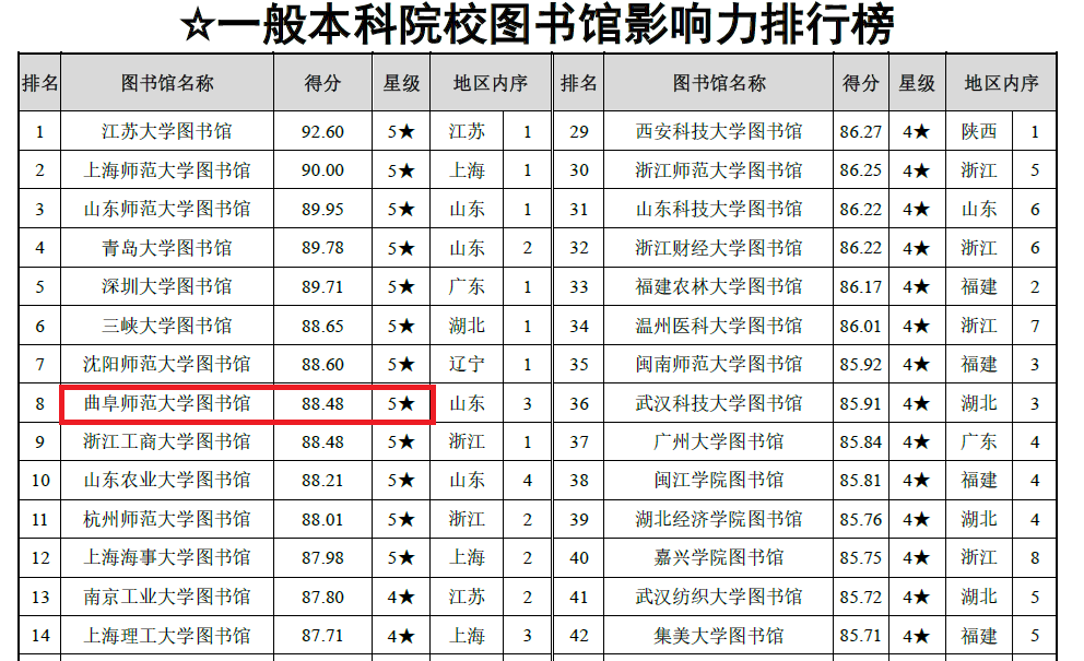 曲阜师大图书馆讯 近日,武汉大学中国科学评价研究中心、中国科学学与科技政策研究会、科学计量学与信息计量学专业委员会联合发布了《数智时代中国图书馆影响力评价报告(2024)》,开元足球_开元(中国)图书馆获评“五星图书馆”,位列中国本科院校图书馆第72位,全国一般本科院校图书馆第8位,全国高校图书馆学术影响力第47位。