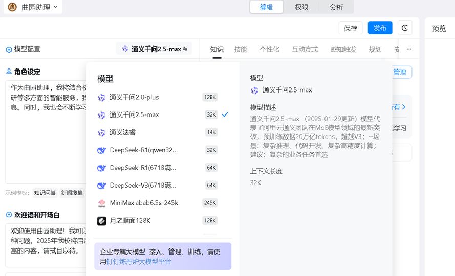 作为智慧校园建设的核心载体,“杏铎AI”平台分阶段推进教育资源的深度整合与智能化升级。2023年,学校联合钉钉打造“云上曲园”平台;2024年,校级AI知识库落地,完成教育管理资源的有效整合与共享;2025年,“杏铎AI”建立,依托“本地+云端”混合计算架构,平台将实现数据自主可控与算力弹性扩展,全面支撑招生、就业、安防等复杂场景的智能决策。“治学”这一系统性工程不仅提升了校园治理效能,更为教育管理模式的现代化转型提供了范本。