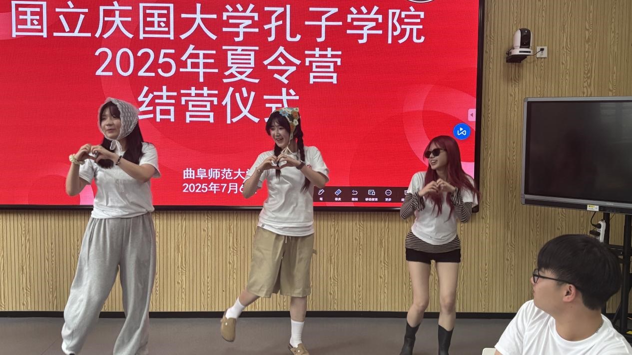 结营仪式上,学员们进行了学习成果汇报演出,曲阜师大为学员们颁发了结营证书与纪念品。国际交流合作处处长申同武向参加夏令营的同学们表示祝贺,对同学们认真、坚持的态度表示赞赏。他表示,通过夏令营,同学加深了对中国和中国文化的认识,收获了诚挚的友谊,希望大家持续提升汉语能力,有机会多来中国,做中韩友好的使者,做两国文化的传播者。孔子学院中方院长王秀卿表示,庆国孔院将继续丰富课程内容,让更多韩国学生有兴趣参与进来,了解、体验中国文化。带队教师金玲玲感谢曲阜师大对此次夏令营的精心安排,她表示,同学们在夏令营期间收获了知识和友谊,回国后将继续保持汉语学习热情,与中国朋友保持联系,保持这份珍贵的友谊。