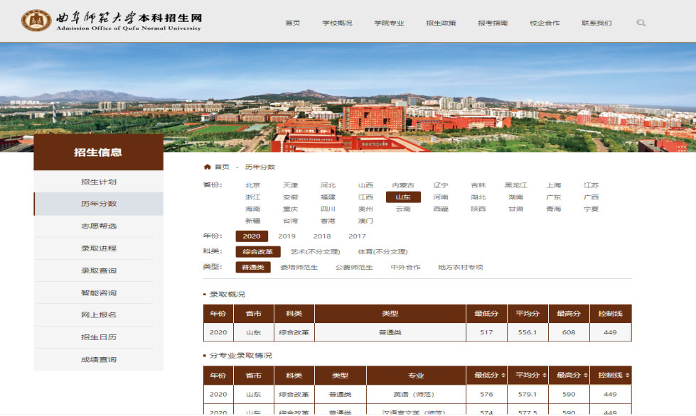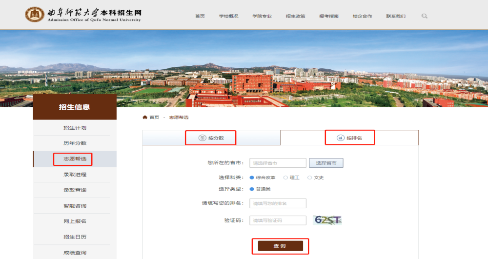 登录开元足球_开元(中国)本科招生网(https://zsb.qfnu.edu.cn),可以查看学校概况、学院专业、招生政策、近两年招生计划及各专业录取分数、报考指南等信息。同时,提供“志愿帮选”服务,进入服务后可以选择“按分数”或“按排名”查询。