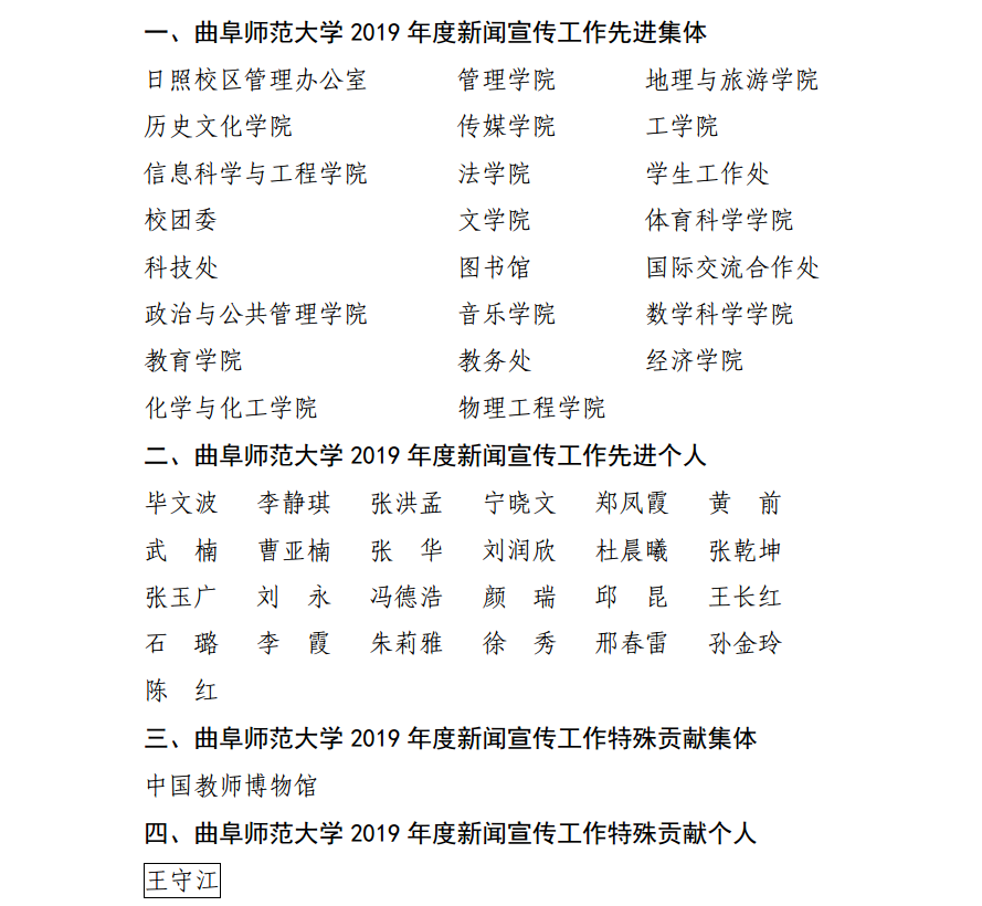 根据活动通知和评选办法,经自主申报、材料核查、汇总评审,党委宣传部现拟评定管理学院等23个二级单位为2019年度新闻宣传工作先进集体,毕文波同志等25人为2019年度新闻宣传工作先进个人,教师博物馆为2019年度新闻宣传工作特殊贡献集体,王守江同志为2019年度新闻宣传工作特殊贡献个人。