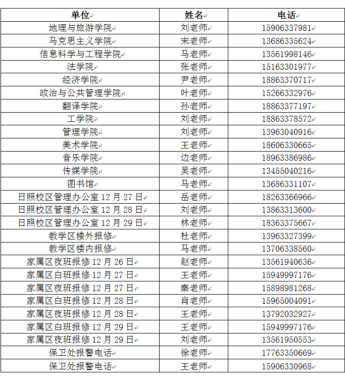 后附日照校区各单位信息员手机号,办公区固话转网期间备用。