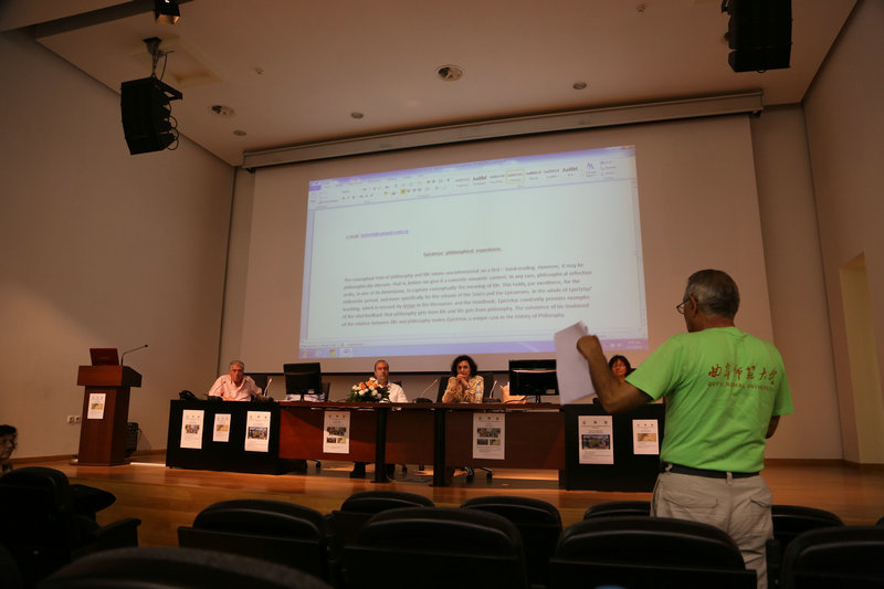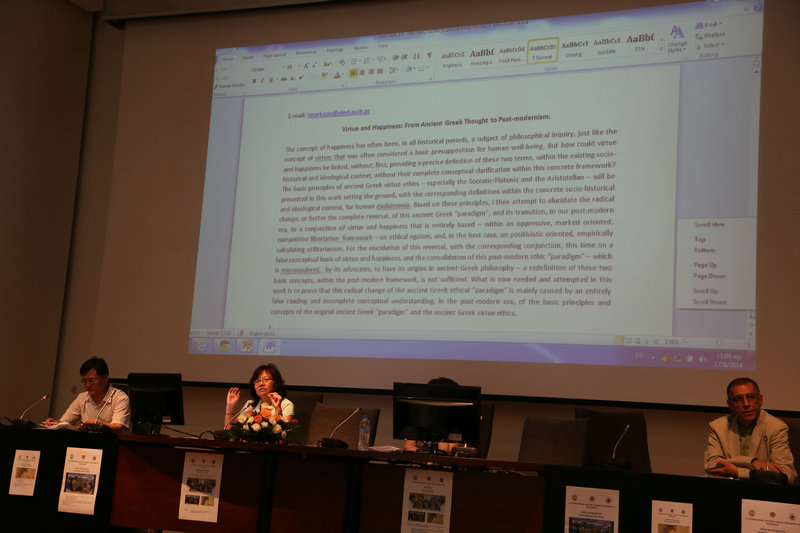 会议围绕着道德与幸福在东西方的起源、在古希腊与中国传统文化中的道德与幸福、道德与幸福在东西方的历史趋向等三大主题展开讨论。中国著名学者陈鼓应先生、亚里士多德大学校长Ioannis Mylopoulos、雅典大学校长Theodosios Pelegrinis、希腊“哲学研究”主编Socratis Delivoyatzis以及我校历史文化学院成积春等在大会上做了发言。